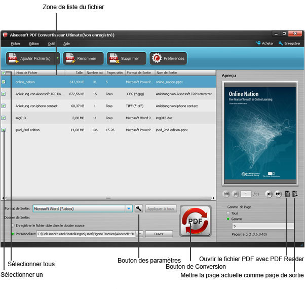 Aiseesoft PDF Convertisseur Ultimate est le PDF Convertisseur le plus professionnel pour convertir PDF en Word, Text, image, ePub, HTML, etc. Après la conversion, vous pouvez facilement profiter du fichier de sortie ou l'éditer sans aucune limitation. De plus, ce logiciel PDF vous permet de faire quelques réglages supplémentaires pour une meilleure sortie.