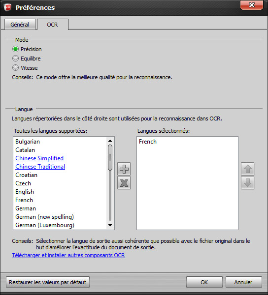 Pour les langues : Chinese Simplified, Chinese Traditional, Janpanese, Korean, vous pouvez cliquer sur la langue et télécharger et installer le composant OCR pour une meilleure utilisation.