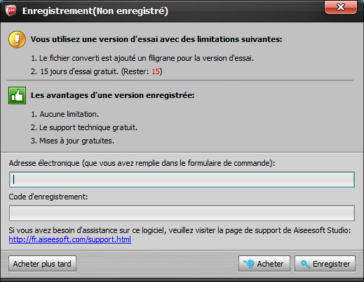 Soyez le bienvenu pour donner votre problème et votre conseil à Aiseesoft. Veuillez contacter notre équipe de support via: fr-support@aiseesoft.com. Notre Service Client vous répondra en un (1) jour ouvrable