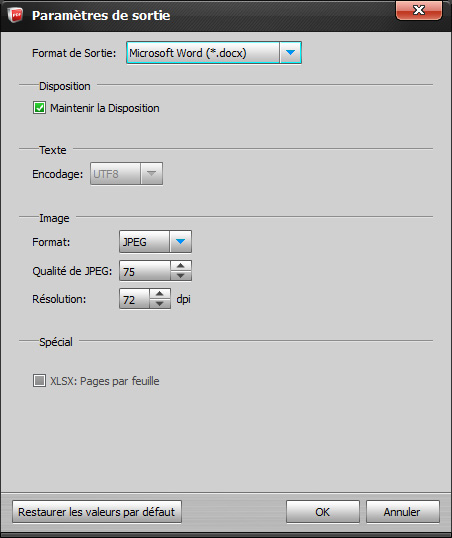 Disposition:Choisissez l'option "Maintenir la Disposition" pour la sortie de Microsoft Word, Rich Texte Format, EPUB, et HTML afin de de maintenir la disposition originale selon vos préférences.