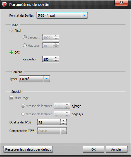 Image:Définir l'effet d'image pour la sortie de Microsoft Word, Microsoft PowerPoint, EPUB, et HTML. Vous pouvez sélectionner le format de l'image de sortie, ajuster la qualité de l'mage JPEG, et définir la résolution de l'image de sortie.